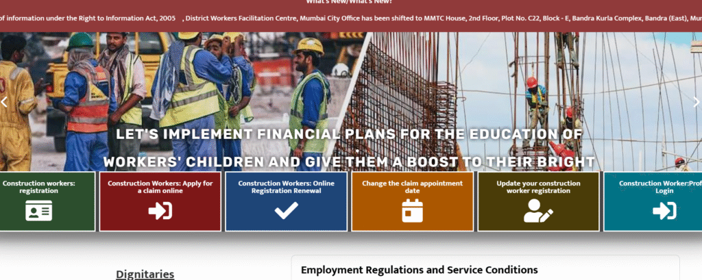 - बंधकाम कामगार योजना में अप्लाई करने के लिए आपको Building And Other Construction Workers’ Welfare Board की ऑफिसियल वेबसाइट (mahabocw.in) पर जाना है